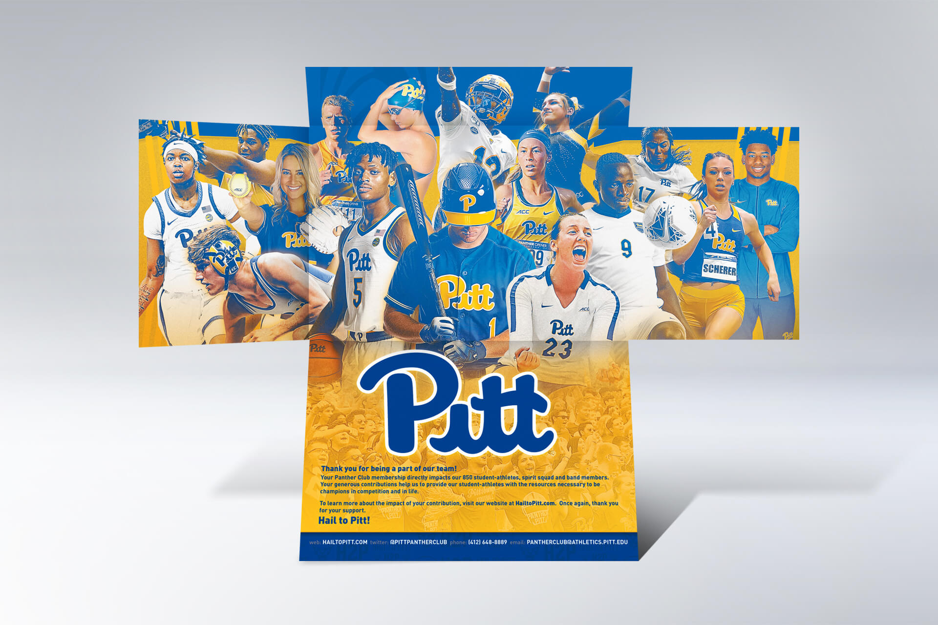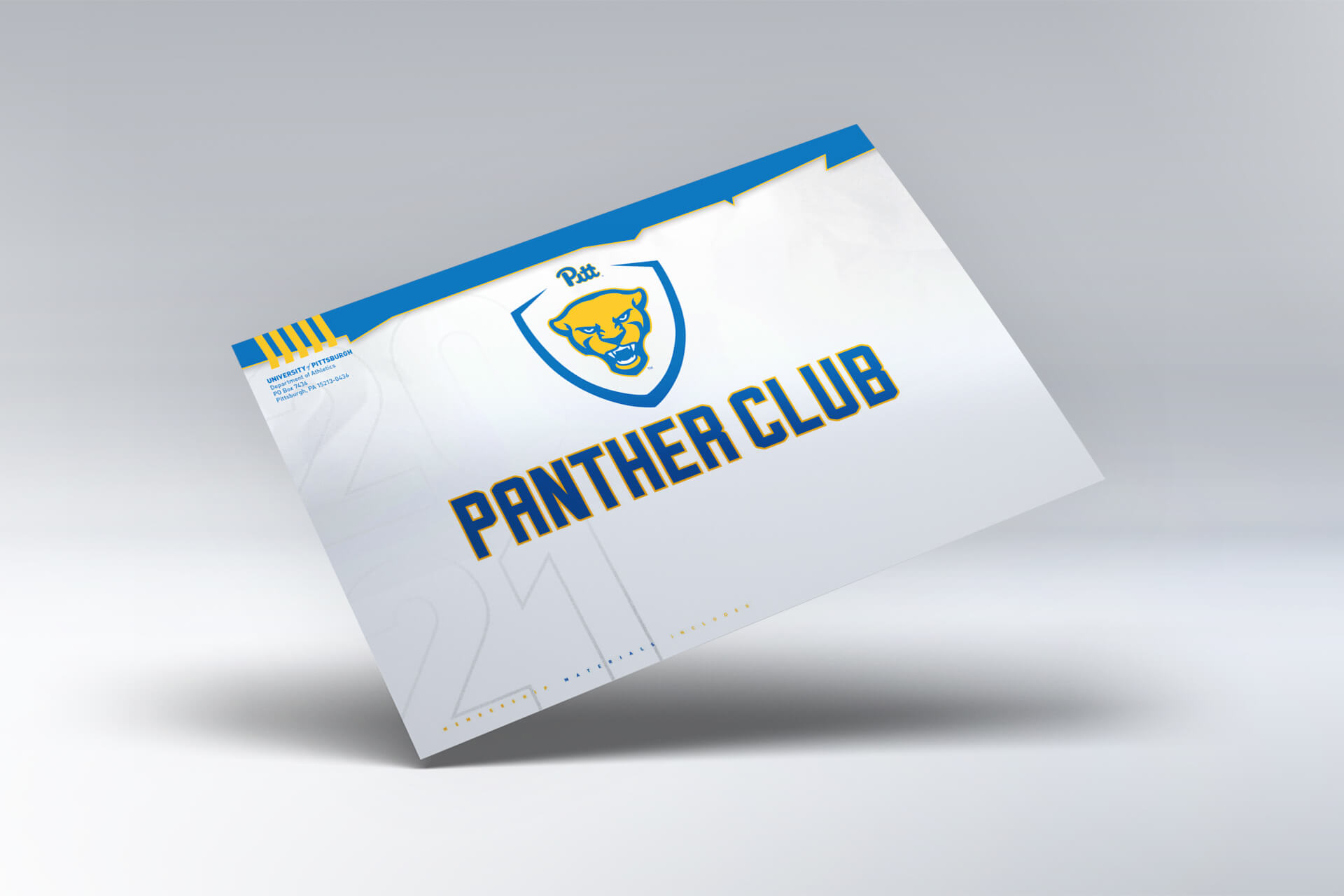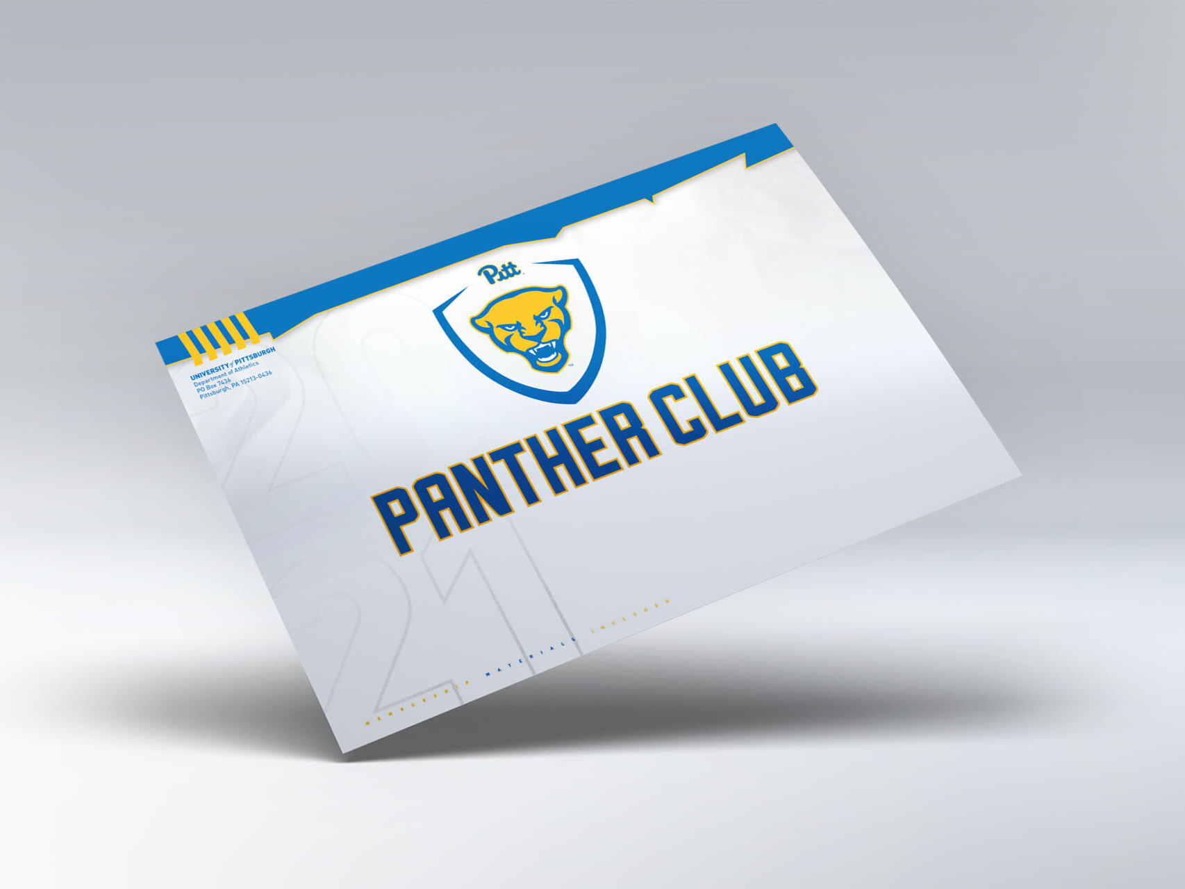 Client:Pitt Panther ClubInstitution:University of PittsburghYear:2020Classification:Athletic StewardshipFormat:6x9 gatefold mailerComponent 1:Variable Member CardComponent 2:Die-Cut MagnetComponent 3:Sunglass CaseComponent 4:Nuckee Phone Stand
